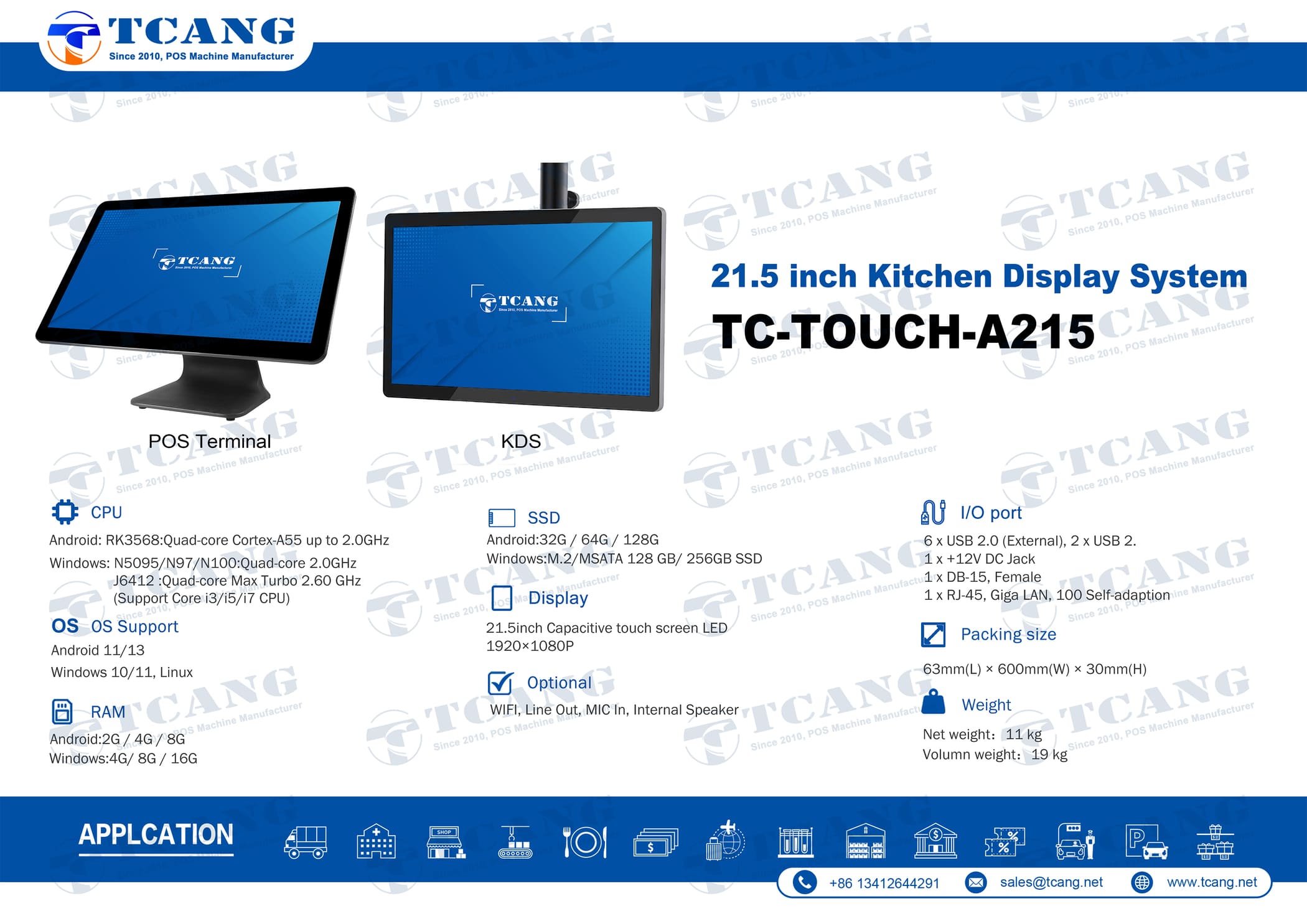 The TC-TOUCH-A215 features a 21.5-inch HD display with a 73% screen-to-body ratio, offering sharp visuals and responsive touch. Its wide viewing area supports multitasking and improves order handling efficiency in busy kitchen and front-end environments.