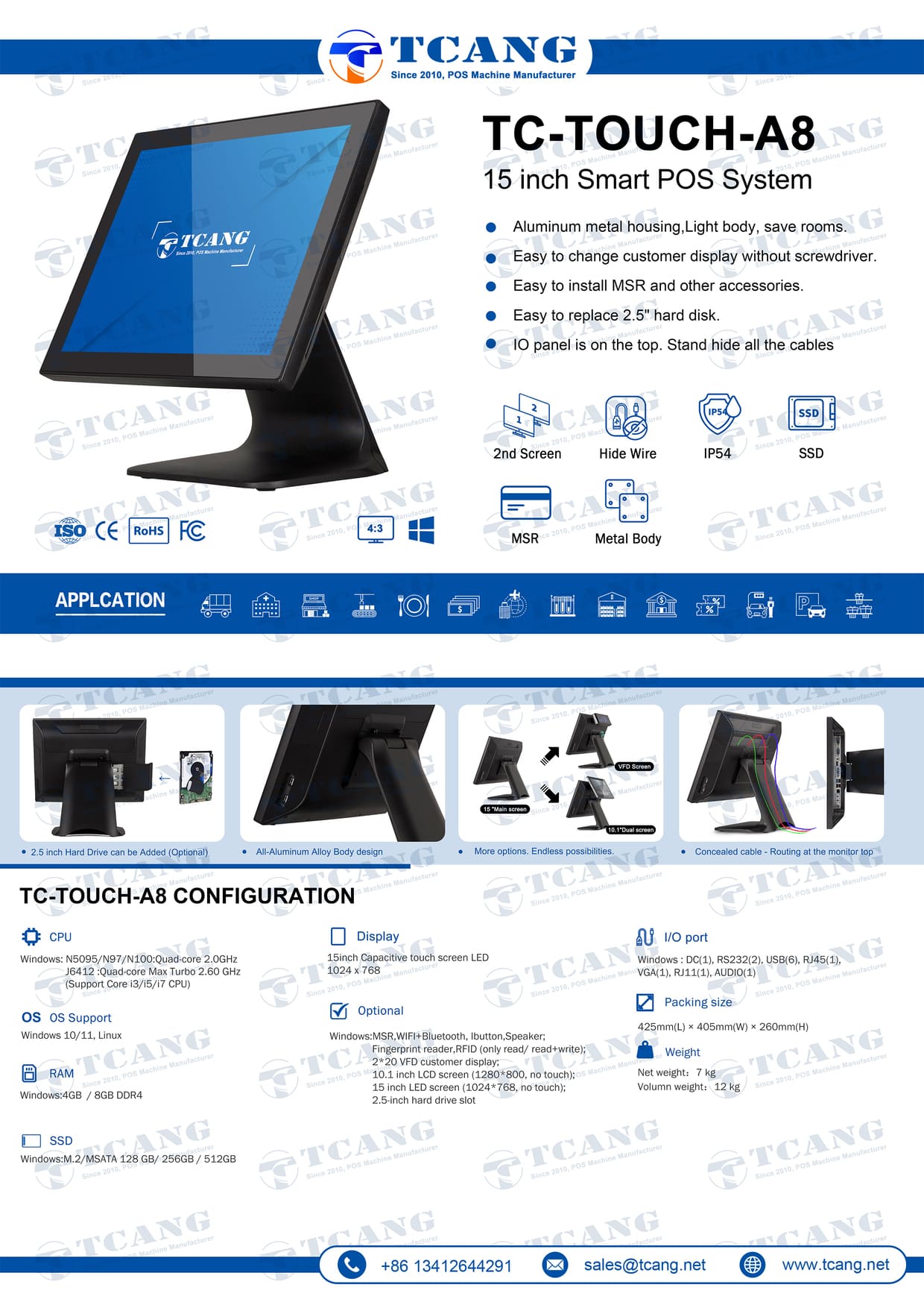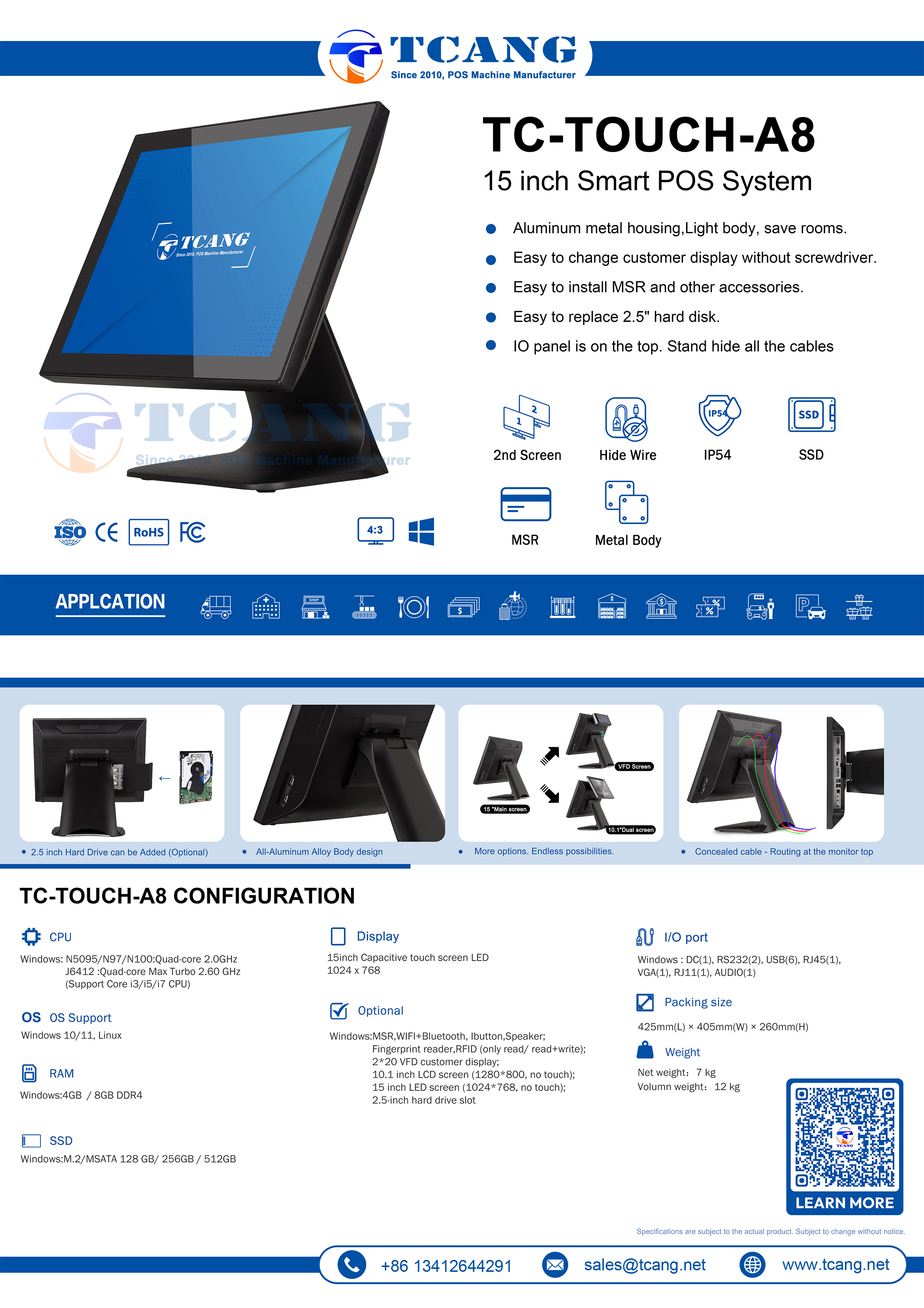 The 15-inch main screen delivers clear, responsive visuals. Optional secondary displays in 15-inch or 10.1-inch sizes can be added for customer interaction, offering flexibility to match different retail and hospitality setups.